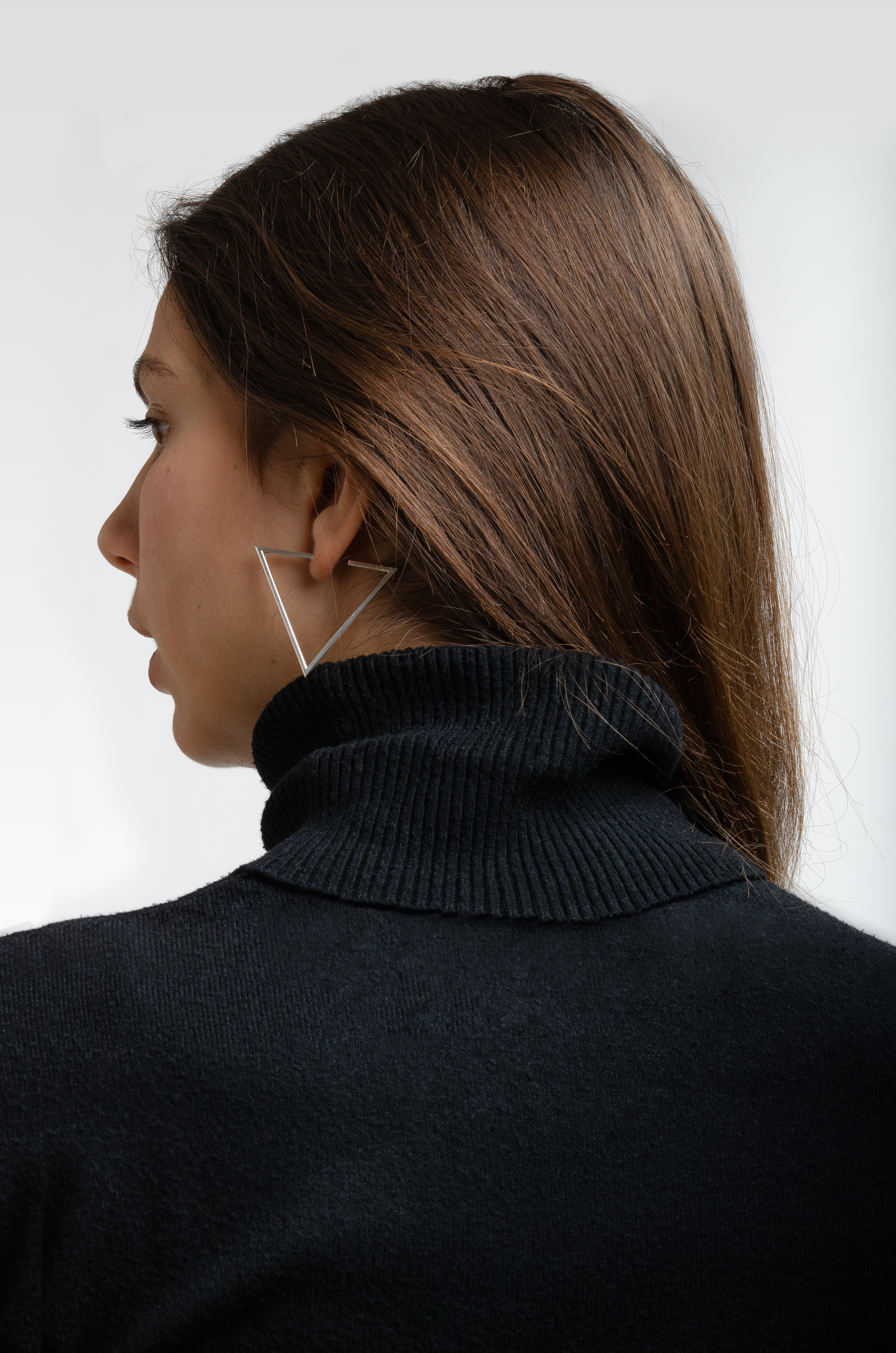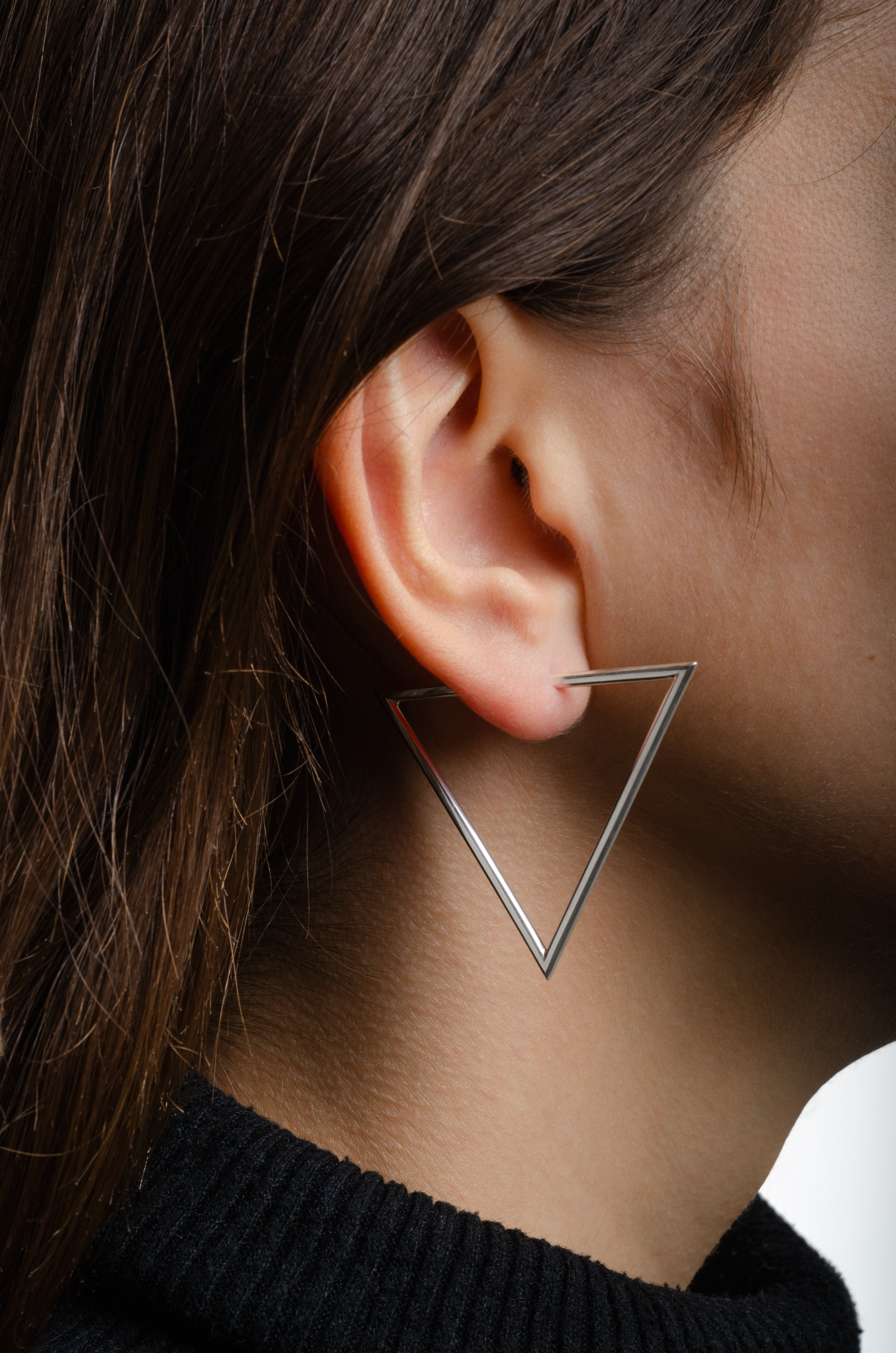 Quand un triangle équilatéral semble traverser le lobe, imitant l’authentique boucle d’oreille créole dans une version moderne et géométrique. De face, il dessine une ligne droite verticale, fine et délicate. Il peut être porté en solitaire ou en paire (PRIX À L’UNITÉ). Deux tailles sont disponibles (S et M).